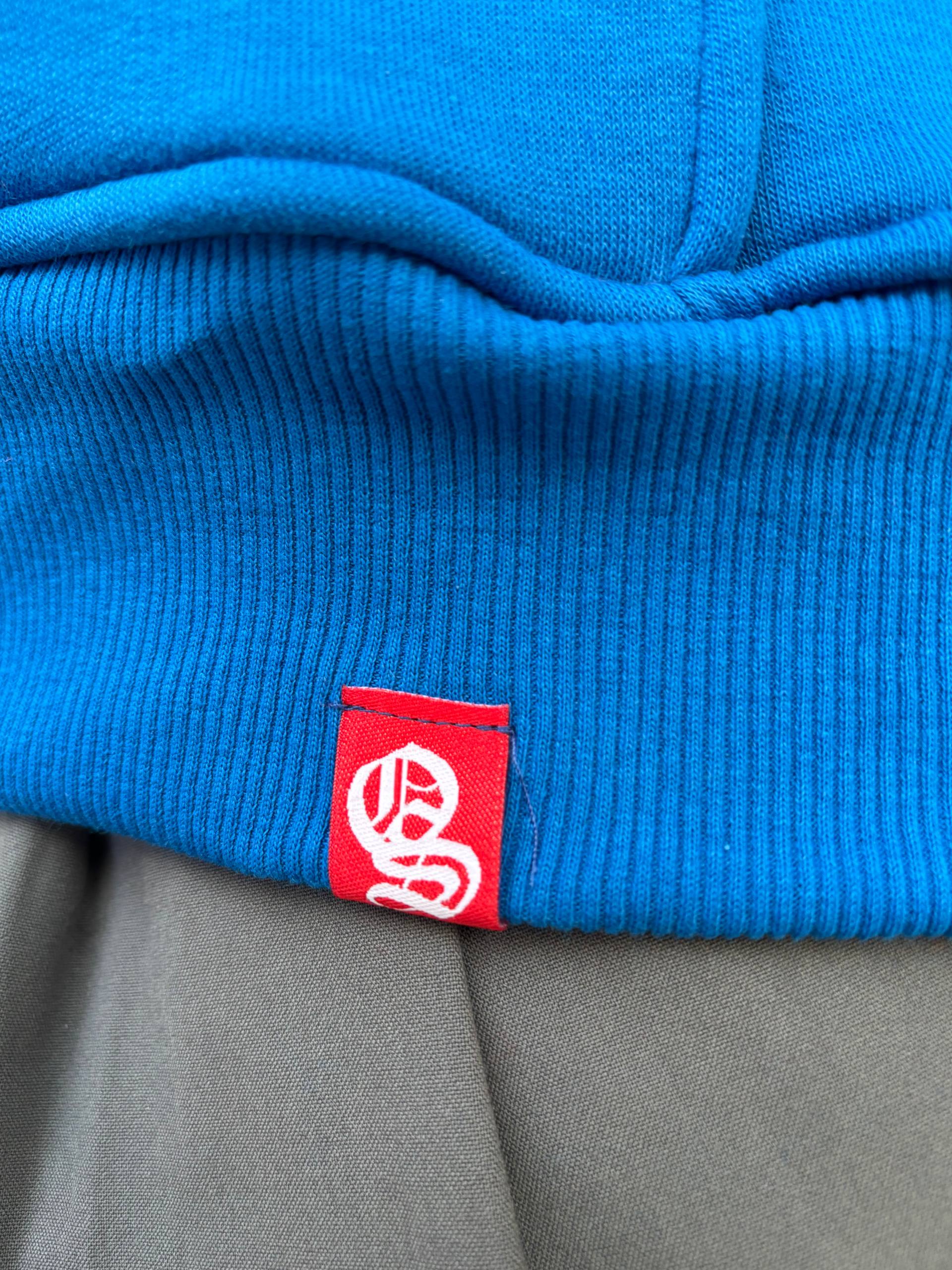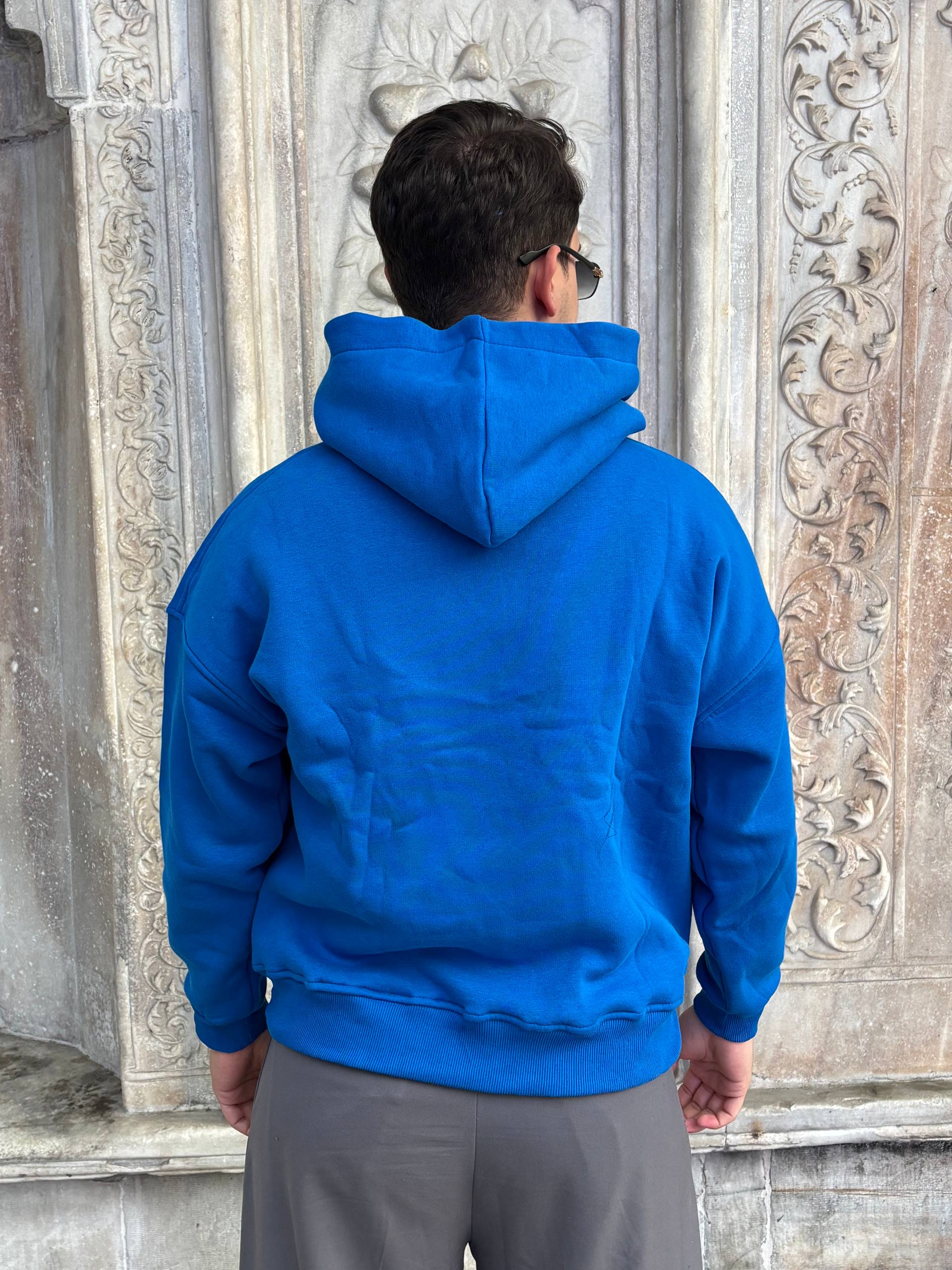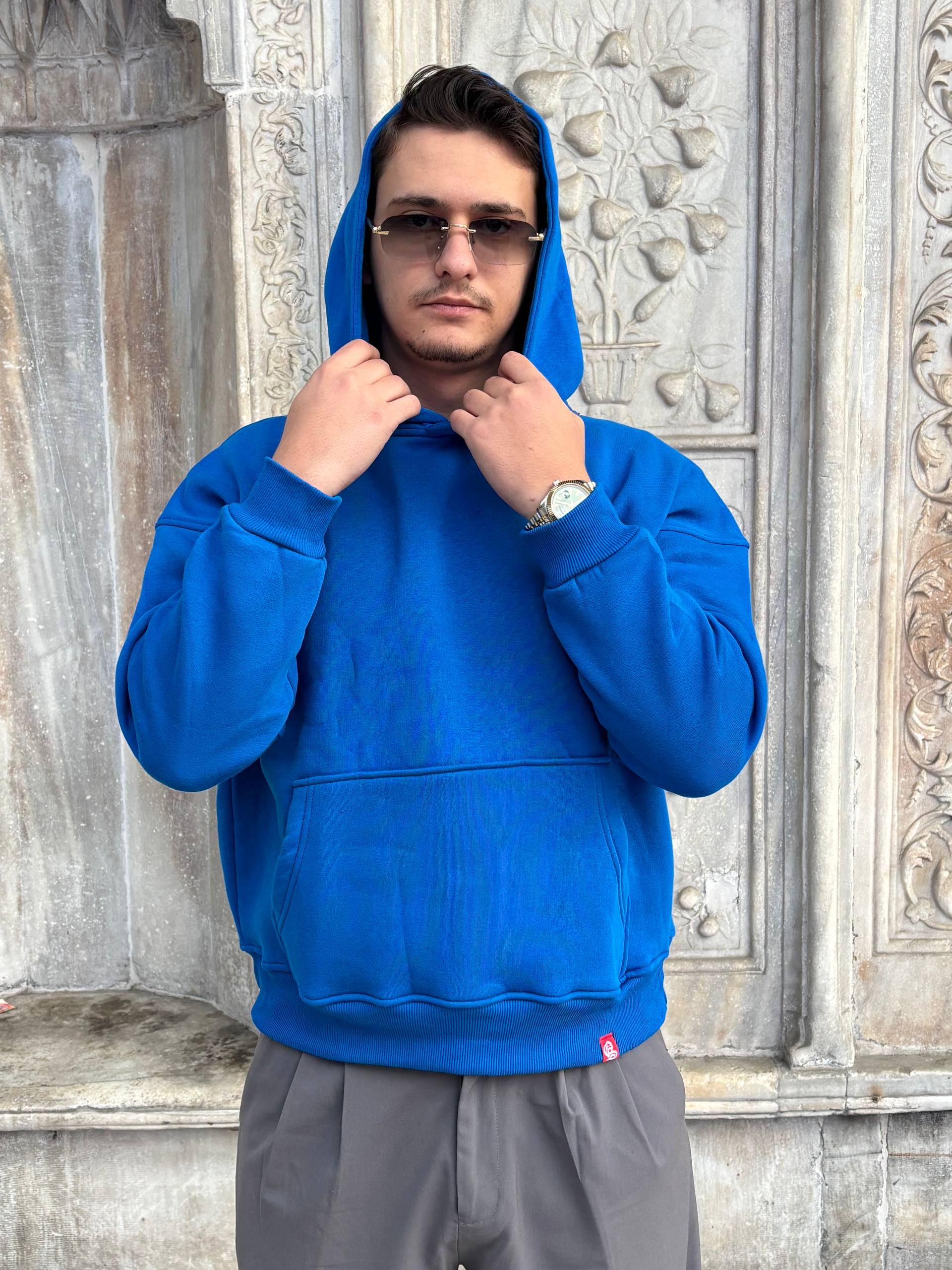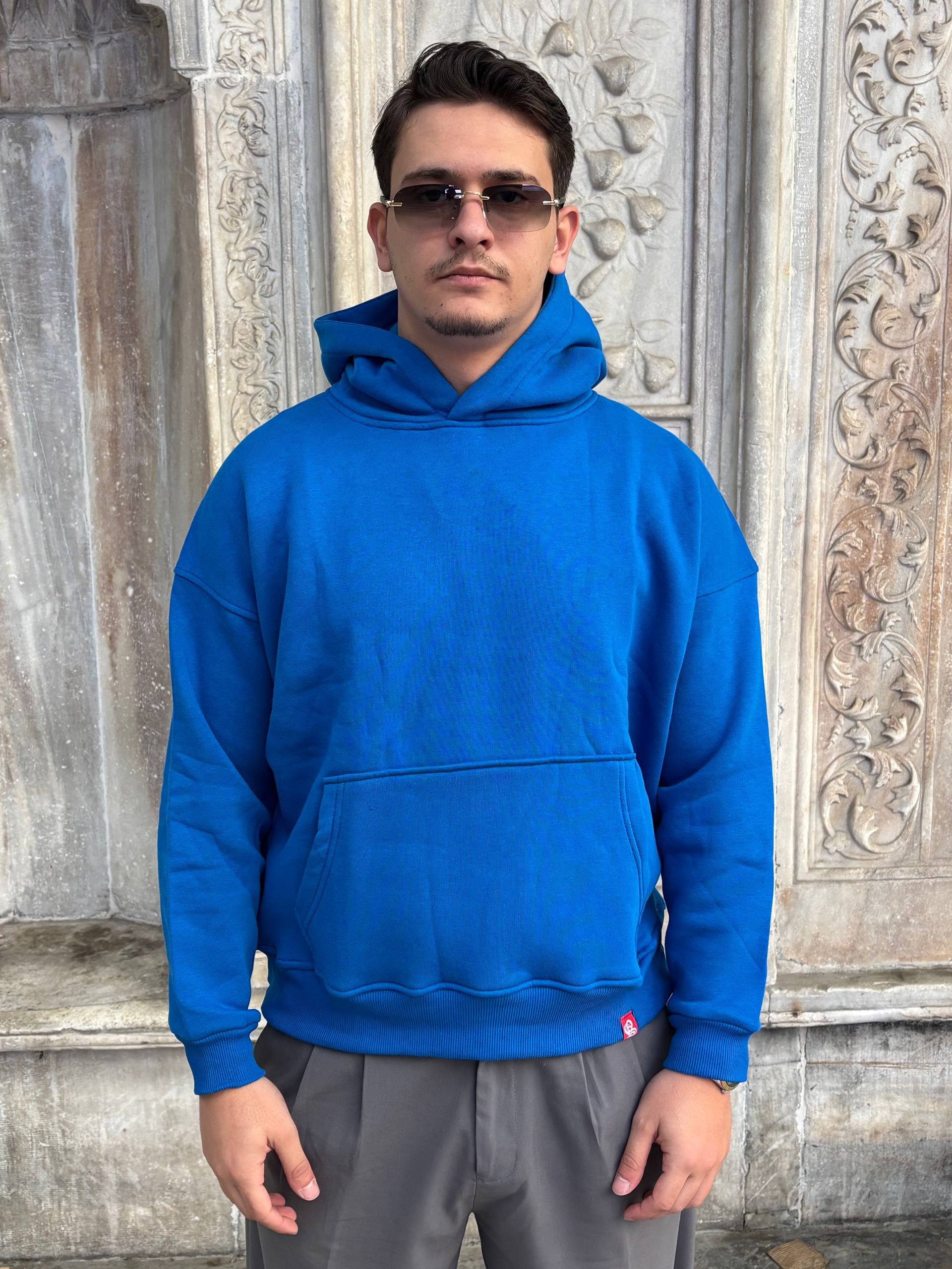 Mėlynas didelis paprastas džemperis su gobtuvu